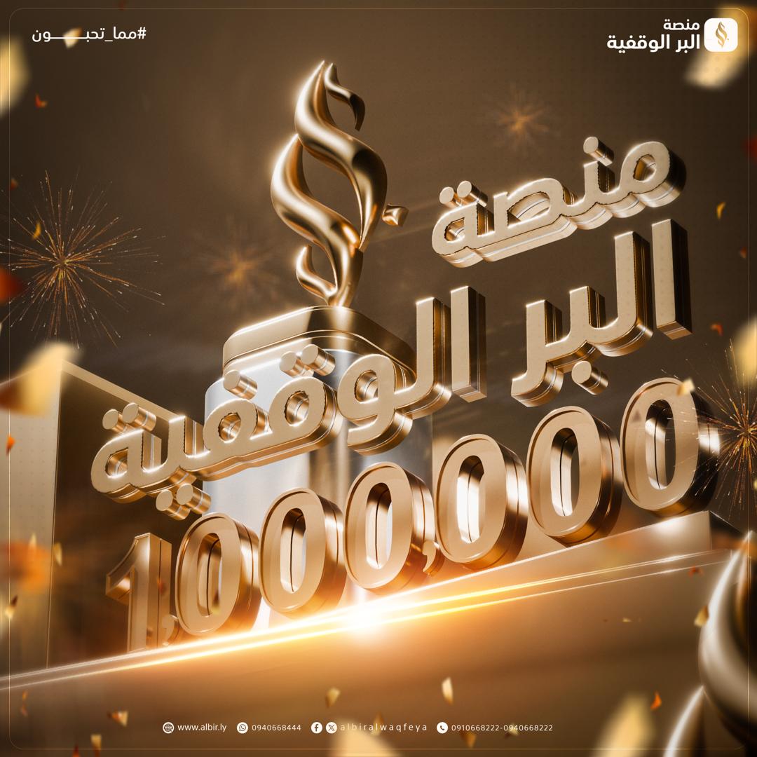 بحمد الله وتوفيقه، وبفضل ثقة أهل الخير وأصحاب الأيادي البيضاء، تعلن منصة البر الوقفية وصول إجمالي المساهمات إلى مليون دينار ليبي، خُصصت لدعم مشاريع خيرية وتنموية مستدامة، كان لها الأثر المباشر في خدمة بيوت الله، وحفر الآبار، ودعم حلقات تحفيظ القرآن الكريم، ومساندة المحتاجين في عدد من المناطق.