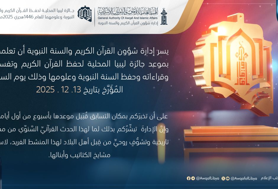 يسر إدارة شؤون القرآن الكريم والسنة النبوية أن تعلمكم بموعد #جائزة_ليبيا_المحلية لحفظ القرآن الكريم وتفسيره وقراءاته وحفظ السنة النبوية وعلومها وذلك يوم السبت المُؤَرَّخ بتاريخ 13. 12 . 2025 م