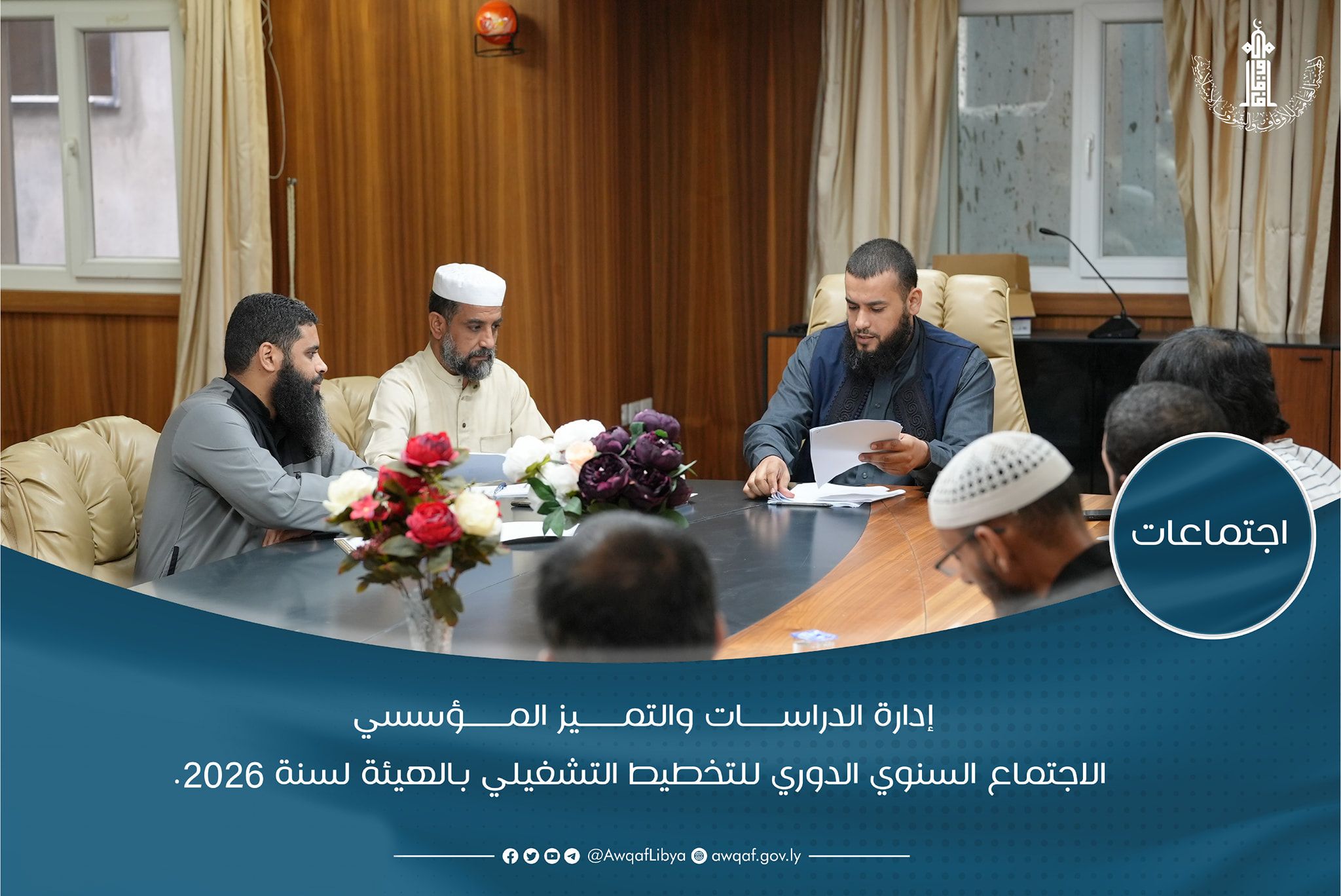 وقد ترأس الاجتماع السيد/ أحمد أبوالقاسم الجليدي مدير إدارة الدراسات والتميز المؤسسي، بمشاركة من ممثلين عن كافة الإدارات والمكاتب بديوان الهيئة، وقد ناقش المجتمعون خلال اللقاء أوجه التعاون المشترك بين الإدارات والمكاتب لتنفيذ مسار التخطيط التشغيلي العام بالهيئة لسنة 2026 وفق أعلى المعايير المؤسساتية والمهنية، والعمل على تفعيل دور كل إدارة للنهوض بالشأن الدعوي والإداري والخدمي بالهيئة، كما تمت مناقشة الخطوات التنفيذية والأطر الزمنية المحددة لإنجاز أعمال الفريق المكلف من قبل السيد رئيس الهيئة